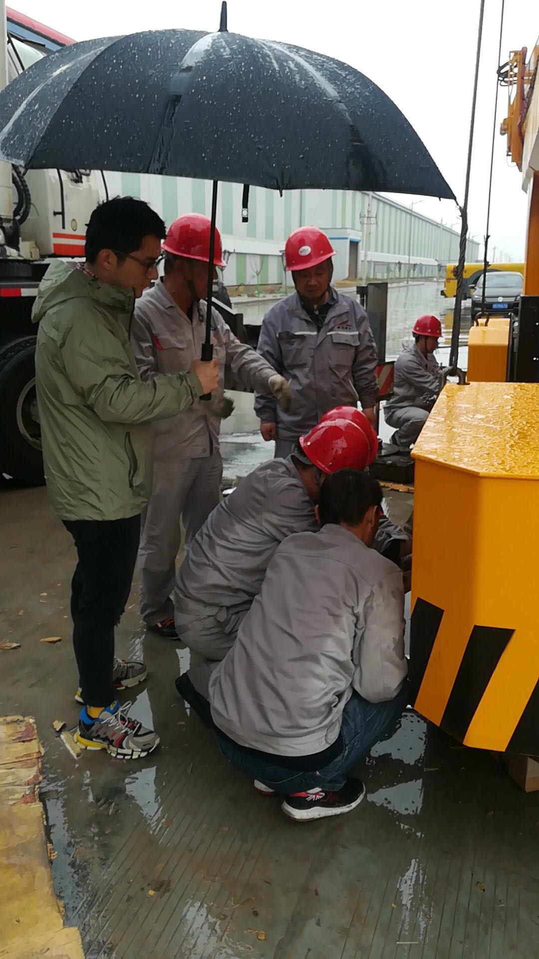 為保證順利完成開箱任務(wù),工藝車隊(duì)最初采取拆卸螺絲、人工撬方式進(jìn)行破解,然而效果不佳,隨之從二十一冶借來電據(jù),車隊(duì)職工輪流作業(yè)不停歇,用3個小時,將包裝箱鋸斷破拆。下午4時,兩臺大型吊車同時發(fā)力,將氟化鹽車騰空吊起。但因?yàn)檫h(yuǎn)洋運(yùn)輸安全考慮,車輛并未安裝輪胎,6條輪胎需要在空中完成快速安裝。此時,天公不作美下起雨來,待輪胎安裝好一側(cè)時,小雨轉(zhuǎn)大雨。考驗(yàn)工藝車隊(duì)職工技術(shù)和毅力的時候到了,一定要贏得和天公的比賽。參與安裝輪胎的職工無論專業(yè)非專業(yè),大家齊上手,毫不懈怠,經(jīng)過兩個小時的持續(xù)努力,氟化鹽車輪胎安裝工作順利完成。此時,雨水,汗水已將每一名參與著的衣服浸得透濕。顧不得辛苦,看著穩(wěn)穩(wěn)停放在地的氟化鹽車,大家擦著汗水和雨水,臉上都洋溢著勝利者喜悅。