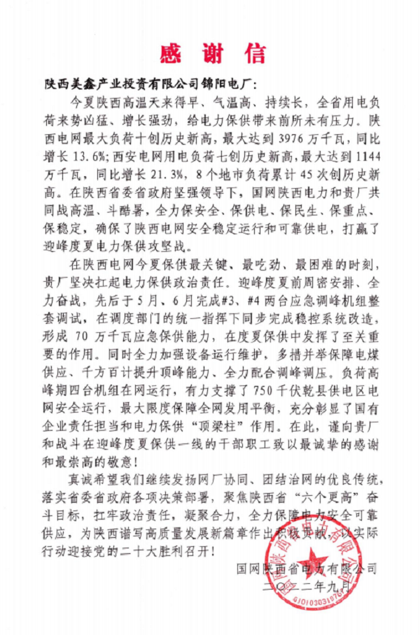 2022年9月,國網(wǎng)陜西省電力有限公司向錦陽電廠發(fā)來感謝信,對錦陽電廠在迎峰度夏期間奮戰(zhàn)一線戰(zhàn)高溫、斗酷暑、保供電的干部職工予以感謝。 為認(rèn)真貫徹落實(shí)上級有關(guān)疫情防控、安全生產(chǎn)、電力保供的決策部署,錦陽電廠不懼抗疫保電雙重壓力,科學(xué)應(yīng)對、精準(zhǔn)施策,提前制定迎峰度夏、可靠供電及電網(wǎng)安全工作方案,建立用電保障24小時(shí)生產(chǎn)現(xiàn)場領(lǐng)導(dǎo)帶班工作機(jī)制,持續(xù)強(qiáng)化運(yùn)行管理,加強(qiáng)設(shè)備巡檢力度及頻次,全面提高設(shè)備健康水平,為迎峰度夏安全生產(chǎn)打牢堅(jiān)實(shí)基礎(chǔ)。在國網(wǎng)陜西省電力有限公司及美鑫公司的大力支持和關(guān)懷下,電廠全體職工及外委單位同心同向、沖鋒在前、攻堅(jiān)克難、堅(jiān)守陣地,在做好鋁鎂合金可靠供電的前提下,全面打贏保安全、保供電、戰(zhàn)疫情攻堅(jiān)戰(zhàn)! 接下來,錦陽電廠將一如既往扛起責(zé)任,以昂揚(yáng)的斗志、堅(jiān)定的信念,全力保障電力安全可靠供應(yīng),以優(yōu)異的成績迎接黨的二十大勝利召開。 |