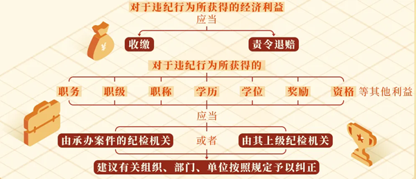 《中國共產(chǎn)黨紀律處分條例》對于違紀行為所獲利益如何處理作出了規(guī)定。主要分為兩種情況—— 對于違紀行為所獲得的經(jīng)濟利益,應當收繳或者責令退賠。對于主動上交的違紀所得和經(jīng)濟損失賠償,應當予以接收,并按照規(guī)定收繳或者返還有關單位、個人。 依照《中國共產(chǎn)黨紀律處分條例》《中華人民共和國公職人員政務處分法》及相關指導性案例,在追究黨紀責任時,處置涉案財物的主要方式為“收繳”和“責令退賠”;在追究監(jiān)察責任時,處置涉案財物的主要方式為“沒收”“追繳”和“責令退賠”。其中,追究黨紀責任時對違紀所得予以“收繳”,相當于追究監(jiān)察責任時對違法所得予以“沒收”和“追繳”。 “收繳”通常針對的是實施違紀違法行為所獲得的財物及其孳息收益,“責令退賠”通常針對的是違反規(guī)定揮霍浪費國有資產(chǎn),如公款吃喝、公款旅游以及違反規(guī)定亂罰款、亂收費獲得的財物等,責令被審查調(diào)查人將違紀違法所得的財物予以歸還,財物已經(jīng)被消耗、毀損的,應當用與之價值相當?shù)呢斘镉枰再r償,責令退賠的財物直接退賠原所有人或原持有人,無法退賠的上繳國庫。 對于違紀行為所獲得的職務、職級、職稱、學歷、學位、獎勵、資格等其他利益,應當由承辦案件的紀檢機關或者由其上級紀檢機關建議有關組織、部門、單位按照規(guī)定予以糾正。 這里的“有關組織、部門、單位”,主要是指對違紀行為所獲得的職務、職級、職稱、學歷、學位、獎勵、資格等其他利益有權予以糾正的組織、部門、單位。 同時,結合《條例》第三十七條、第三十八條規(guī)定,對違紀后下落不明的黨員,黨組織作出處分決定前死亡的黨員,或者死亡之后發(fā)現(xiàn)曾有嚴重違紀行為的黨員,經(jīng)調(diào)查確屬其實施違紀行為獲得的利益,也應當依照上述規(guī)定處理。 |