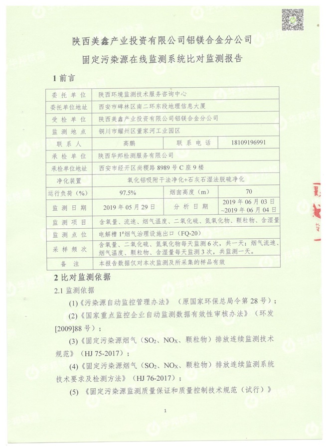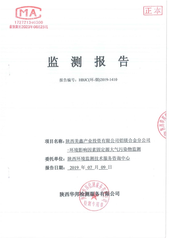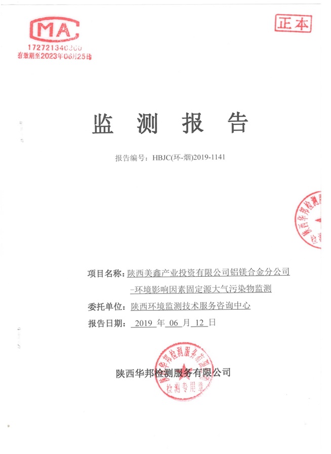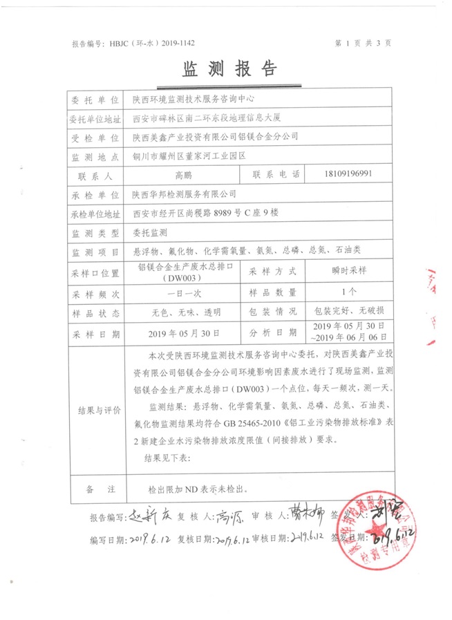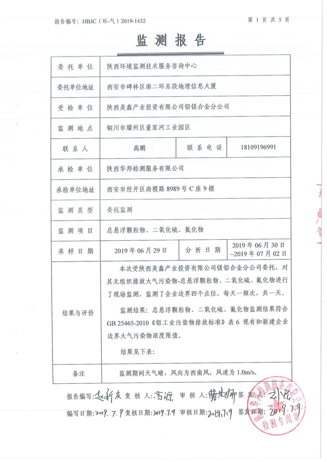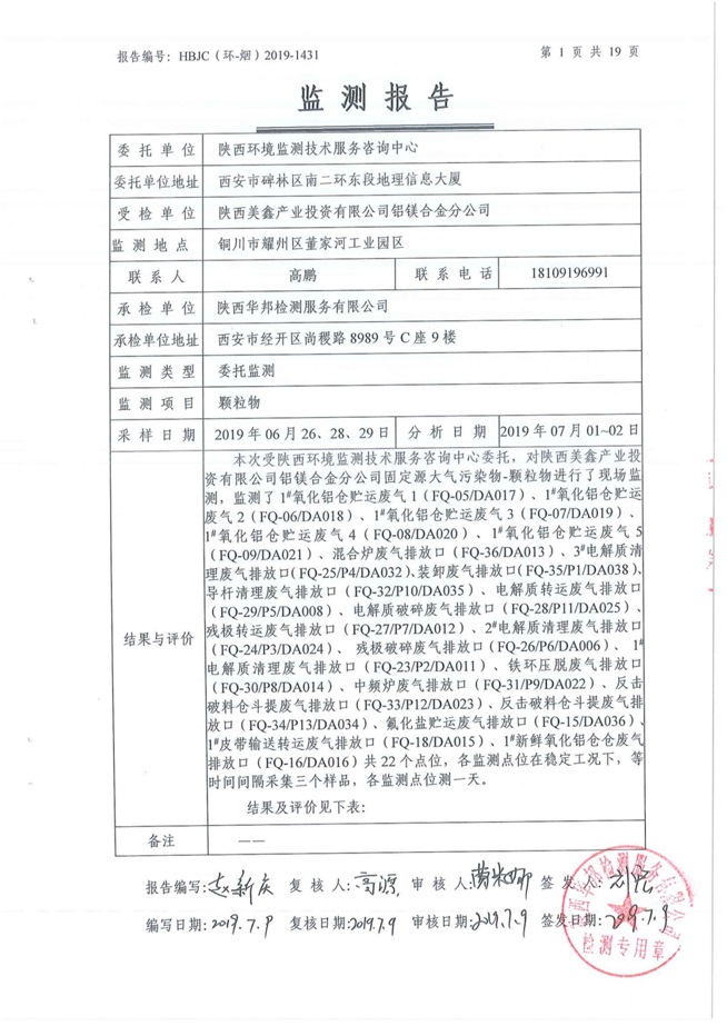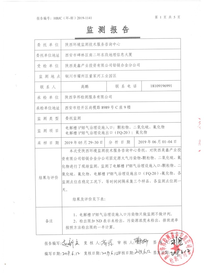 一、基礎(chǔ)信息: 陜西美鑫產(chǎn)業(yè)投資有限公司 統(tǒng)一社會(huì)信用代碼:91610200567136996Y 法定代表人:高曉兵 生產(chǎn)地址:陜西省銅川市董家河工業(yè)園區(qū) 聯(lián)系方式:09196982605 生產(chǎn)經(jīng)營(yíng)和管理服務(wù)的主要內(nèi)容、產(chǎn)品及規(guī)模: 美鑫公司在陜西有色、陜西煤化兩大集團(tuán)的正確領(lǐng)導(dǎo)下,在銅川市委、市政府的關(guān)心支持下,充分利用銅川資源型城市轉(zhuǎn)型政策,依托園區(qū)區(qū)位優(yōu)勢(shì),擬投資150億元,建設(shè)年產(chǎn)30萬(wàn)噸預(yù)焙陽(yáng)極、120萬(wàn)噸煤礦、30萬(wàn)噸鋁鎂合金及配套動(dòng)力站、20萬(wàn)噸鋁深加工、年吞吐量500—800萬(wàn)噸物流園等循環(huán)經(jīng)濟(jì)項(xiàng)目。該集群項(xiàng)目已被列入《陜西省國(guó)民經(jīng)濟(jì)和社會(huì)發(fā)展第十二個(gè)五年規(guī)劃綱要》,為陜西省“58123”項(xiàng)目之一。美鑫公司以循環(huán)經(jīng)濟(jì)為路徑,堅(jiān)持經(jīng)濟(jì)增長(zhǎng)與環(huán)境保護(hù)協(xié)調(diào)發(fā)展,聚合資源與資本,走綠色發(fā)展、清潔發(fā)展、低碳發(fā)展的循環(huán)經(jīng)濟(jì)轉(zhuǎn)型升級(jí)之路。 陜西美鑫鋁鎂合金分公司采用的500kA預(yù)焙陽(yáng)極電解槽,自動(dòng)化程度高,電解槽打殼、加料全過(guò)程均由微機(jī)自動(dòng)控制,從而使槽罩開啟次數(shù)顯著降低,電解槽集氣效率能夠達(dá)到99%,大大地減少了煙氣無(wú)組織排放。項(xiàng)目配置了2套電解煙氣凈化系統(tǒng),經(jīng)捕集的煙氣通過(guò)排煙支管進(jìn)入排煙總管,采用電解鋁生產(chǎn)原料—氧化鋁吸附阻濾煙氣中的氟化氫氣體及含氟煙塵,吸附后的載負(fù)氧化鋁進(jìn)入袋式除塵器,經(jīng)氣固分離后進(jìn)入石灰石—石膏脫硫系統(tǒng)脫硫。 陜西美鑫產(chǎn)業(yè)投資有限公司鋁鎂合金分公司2019年2季度自行監(jiān)測(cè)如下: 二、監(jiān)測(cè)方案: 1 大氣污染源監(jiān)測(cè)