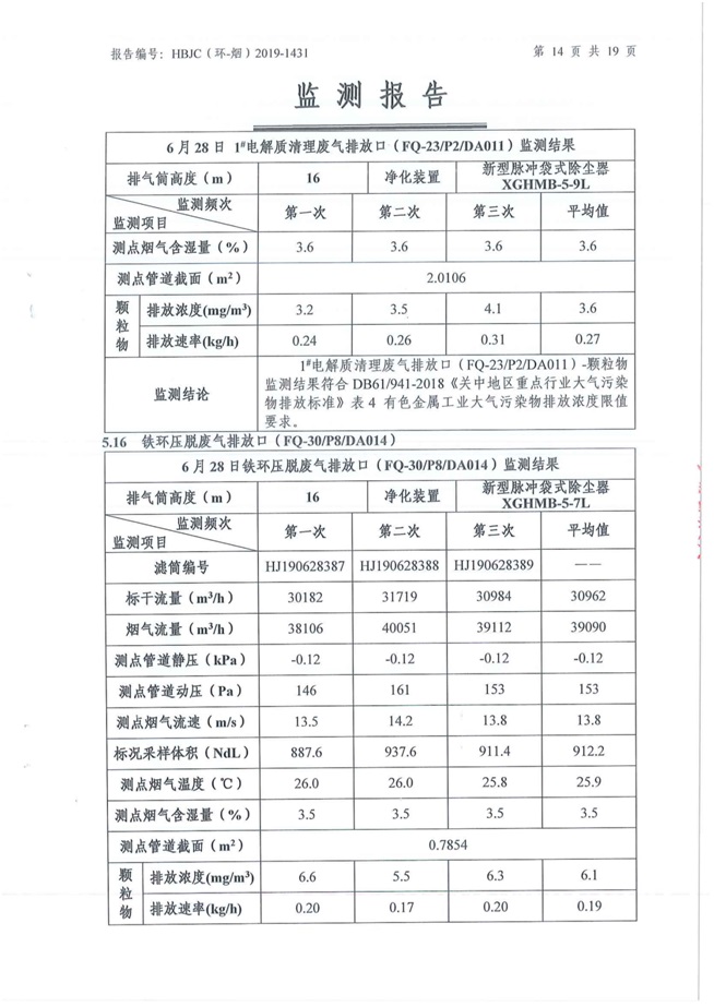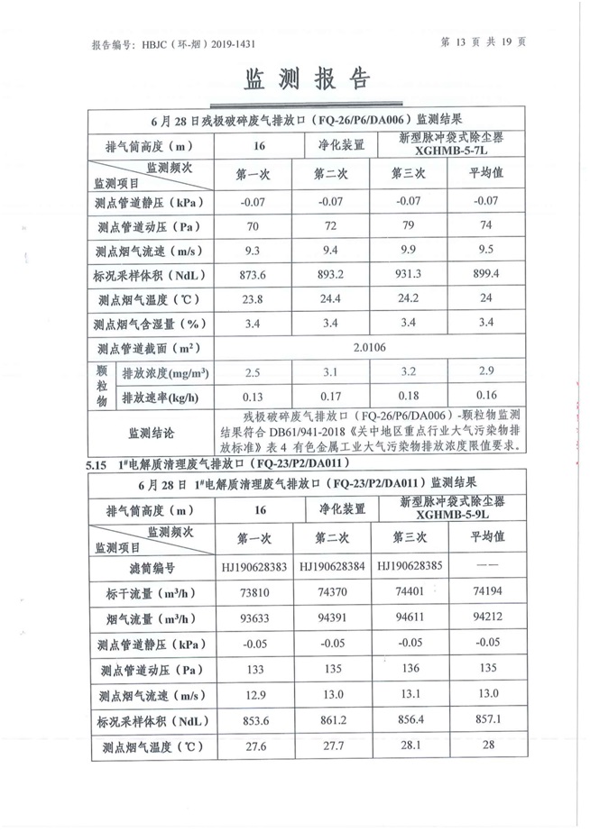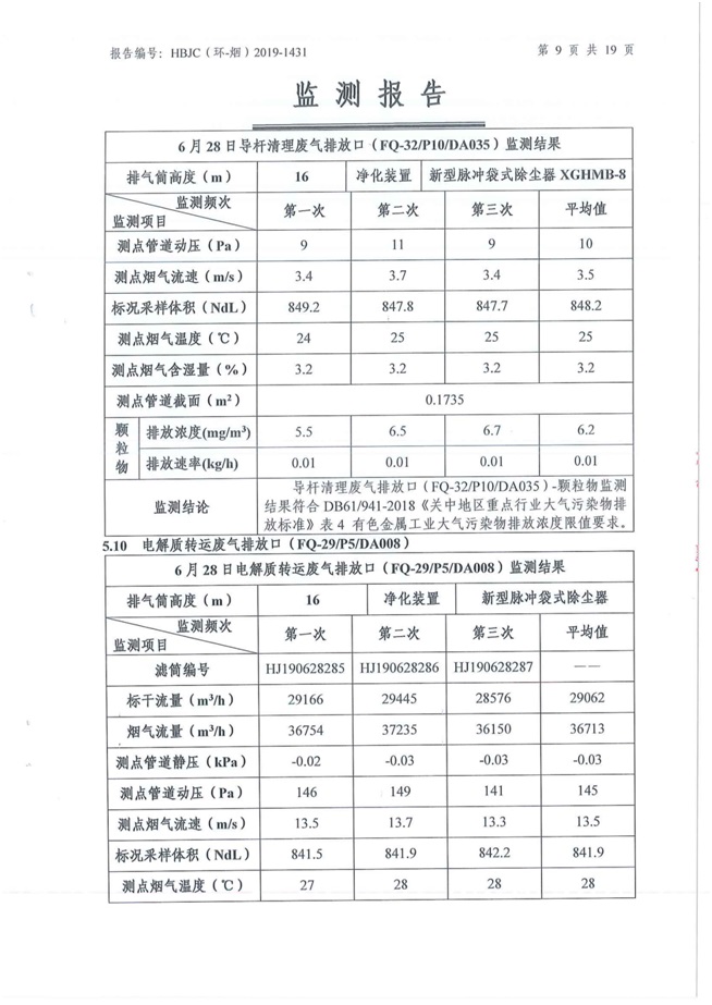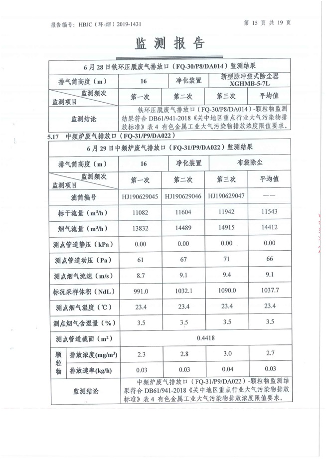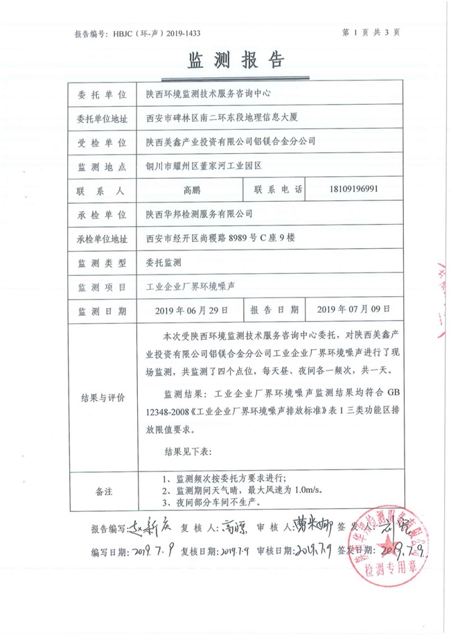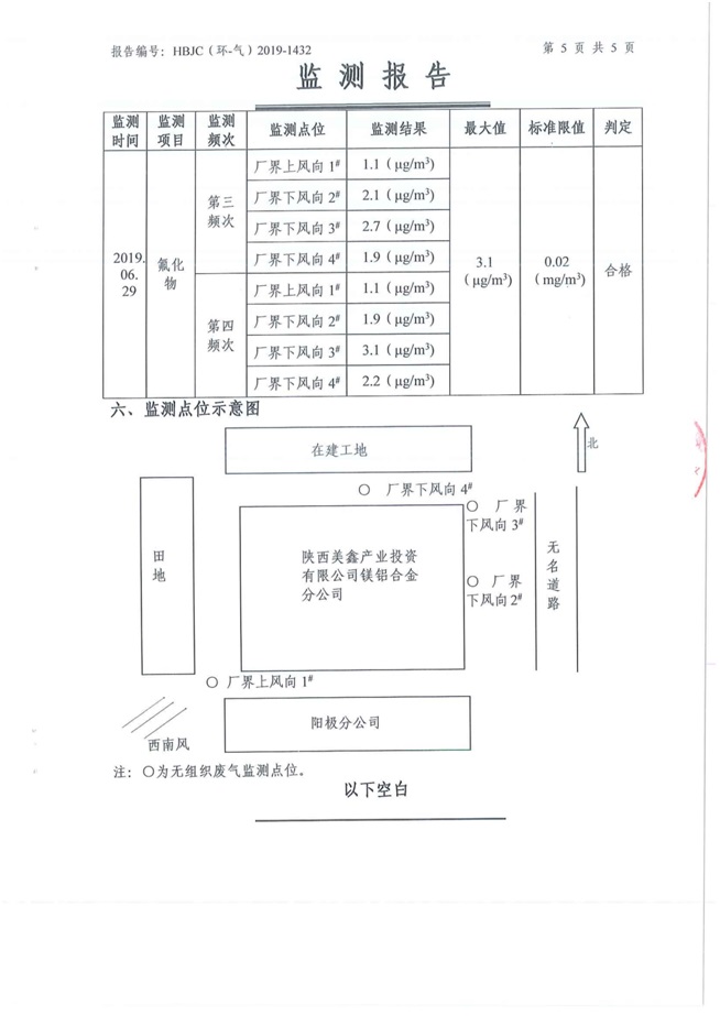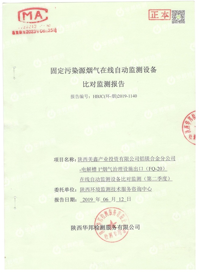 一、基礎(chǔ)信息: 陜西美鑫產(chǎn)業(yè)投資有限公司 統(tǒng)一社會(huì)信用代碼:91610200567136996Y 法定代表人:高曉兵 生產(chǎn)地址:陜西省銅川市董家河工業(yè)園區(qū) 聯(lián)系方式:09196982605 生產(chǎn)經(jīng)營(yíng)和管理服務(wù)的主要內(nèi)容、產(chǎn)品及規(guī)模: 美鑫公司在陜西有色、陜西煤化兩大集團(tuán)的正確領(lǐng)導(dǎo)下,在銅川市委、市政府的關(guān)心支持下,充分利用銅川資源型城市轉(zhuǎn)型政策,依托園區(qū)區(qū)位優(yōu)勢(shì),擬投資150億元,建設(shè)年產(chǎn)30萬(wàn)噸預(yù)焙陽(yáng)極、120萬(wàn)噸煤礦、30萬(wàn)噸鋁鎂合金及配套動(dòng)力站、20萬(wàn)噸鋁深加工、年吞吐量500—800萬(wàn)噸物流園等循環(huán)經(jīng)濟(jì)項(xiàng)目。該集群項(xiàng)目已被列入《陜西省國(guó)民經(jīng)濟(jì)和社會(huì)發(fā)展第十二個(gè)五年規(guī)劃綱要》,為陜西省“58123”項(xiàng)目之一。美鑫公司以循環(huán)經(jīng)濟(jì)為路徑,堅(jiān)持經(jīng)濟(jì)增長(zhǎng)與環(huán)境保護(hù)協(xié)調(diào)發(fā)展,聚合資源與資本,走綠色發(fā)展、清潔發(fā)展、低碳發(fā)展的循環(huán)經(jīng)濟(jì)轉(zhuǎn)型升級(jí)之路。 陜西美鑫鋁鎂合金分公司采用的500kA預(yù)焙陽(yáng)極電解槽,自動(dòng)化程度高,電解槽打殼、加料全過(guò)程均由微機(jī)自動(dòng)控制,從而使槽罩開啟次數(shù)顯著降低,電解槽集氣效率能夠達(dá)到99%,大大地減少了煙氣無(wú)組織排放。項(xiàng)目配置了2套電解煙氣凈化系統(tǒng),經(jīng)捕集的煙氣通過(guò)排煙支管進(jìn)入排煙總管,采用電解鋁生產(chǎn)原料—氧化鋁吸附阻濾煙氣中的氟化氫氣體及含氟煙塵,吸附后的載負(fù)氧化鋁進(jìn)入袋式除塵器,經(jīng)氣固分離后進(jìn)入石灰石—石膏脫硫系統(tǒng)脫硫。 陜西美鑫產(chǎn)業(yè)投資有限公司鋁鎂合金分公司2019年2季度自行監(jiān)測(cè)如下: 二、監(jiān)測(cè)方案: 1 大氣污染源監(jiān)測(cè)