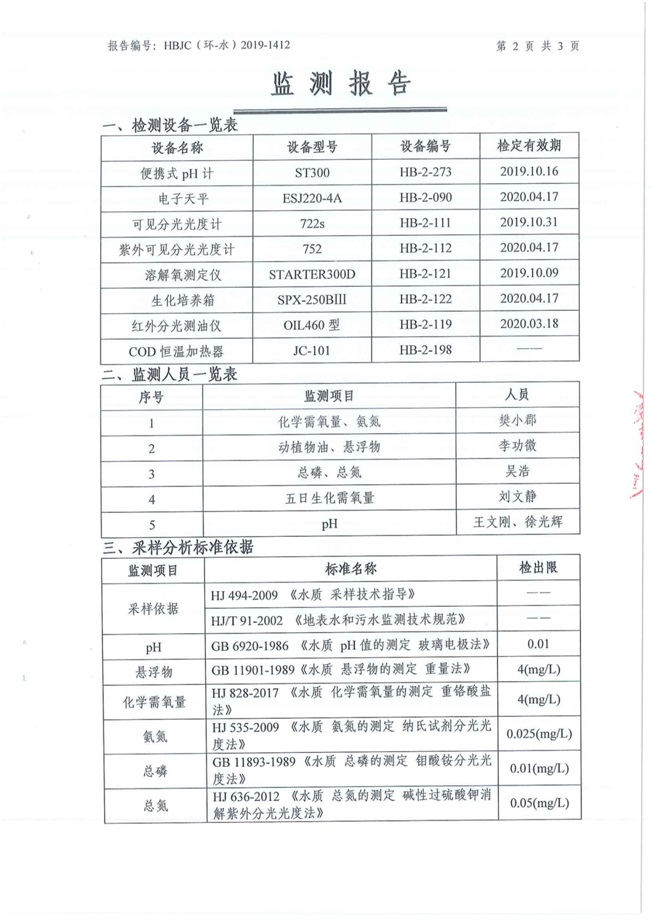 (1)監(jiān)測(cè)指標(biāo):pH值、五日生化需氧量、化學(xué)需氧量、氨氮、懸浮物、動(dòng)植物油、總磷、總氮。 (2)監(jiān)測(cè)點(diǎn)位:生活污水排放口。 (3)監(jiān)測(cè)頻次:每月監(jiān)測(cè)一次,監(jiān)測(cè)1天,每天監(jiān)測(cè)1個(gè)水樣。 2.2生產(chǎn)廢水排口