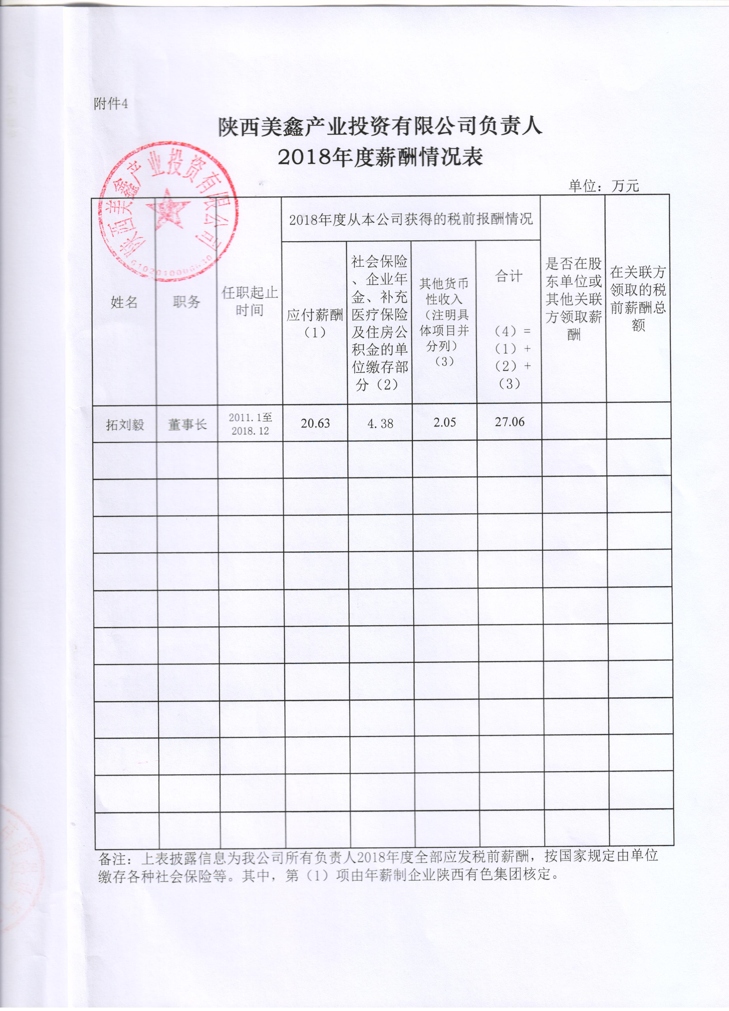 陜西美鑫產(chǎn)業(yè)投資有限公司負(fù)責(zé)人2018年度薪酬情況表